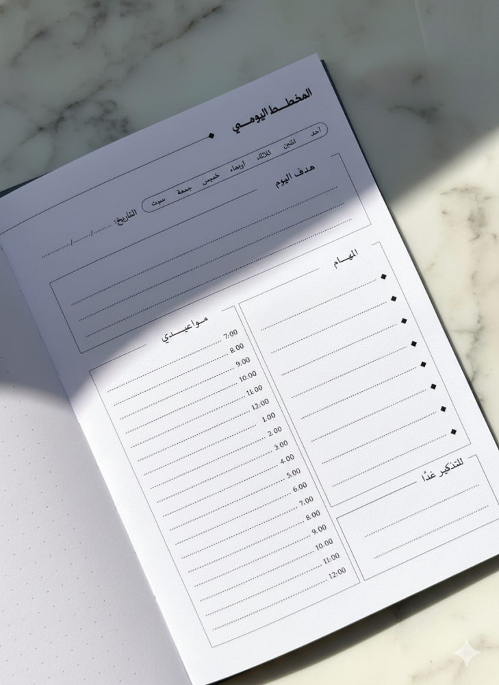 ابدأ يومك بإحساس مختلف مع مفكرتنا، كل صفحة صُممت بعناية لتساعدك على تنظيم مهامك، تتبع إنجازاتك، وصناعة روتين يُشبهك. ستجد مساحة مخصصة لترتيب يومك بدقة، وصفحة منقطة تمنحك حرية التعبير، سواء لتدوين أفكارك أو كتابة ملاحظاتك الخاصة.